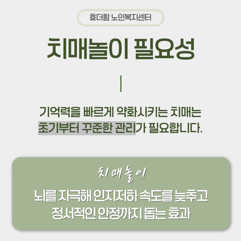 ÀúÈñ È¿´õÇÔ³ëÀκ¹Áö¼¾ÅÍ´Â ¾î¸£½ÅÀÇ ÀÎÁö ±â´ÉÀ» À¯ÁöÇϰí ÅðÇàÀ» ´ÊÃß±â À§ÇÑ Ä¡¸Å ³îÀÌ È°µ¿À» Àü¹®ÀûÀ¸·Î ¾È³»ÇØ µå¸®°í ÀÖ½À´Ï´Ù.