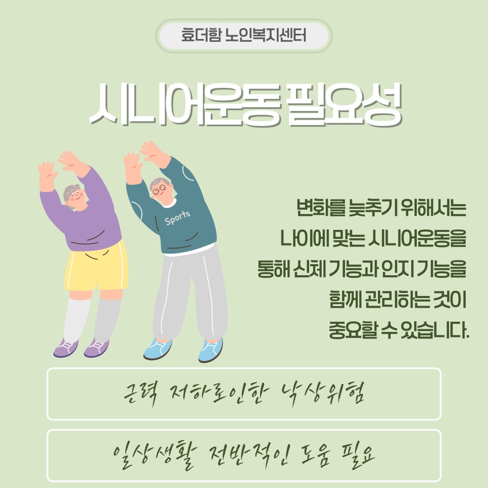 È¿´õÇÔ³ëÀκ¹Áö¼¾ÅÍ¿¡¼´Â ¾î¸£½ÅµéÀÇ ½Åü »óÅ¿¡ ¸Â°Ô À¯»ê¼Ò, ±Ù·Â, À¯¿¬¼º, ±ÕÇü ¿ä¼Ò¸¦ °í¸£°Ô Æ÷ÇÔÇØ¼ µµ¿Íµå¸®°í ÀÖ½À´Ï´Ù!